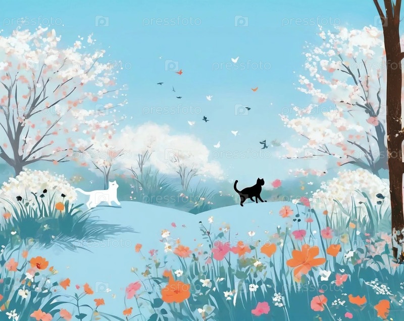 Коты бегают в летнем саду с цветами и деревом