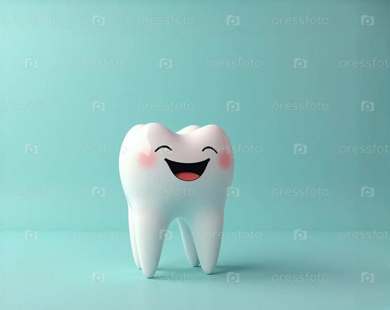 Зуб стоит на полу на фоне стены в больнице и улыбается