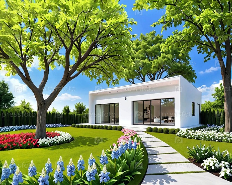 Одноэтажный стильный дом в облагороженном саду с цветами деревьями