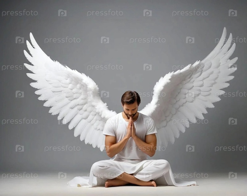 Мужчина с крыльями ангела молится, сидя на полу
