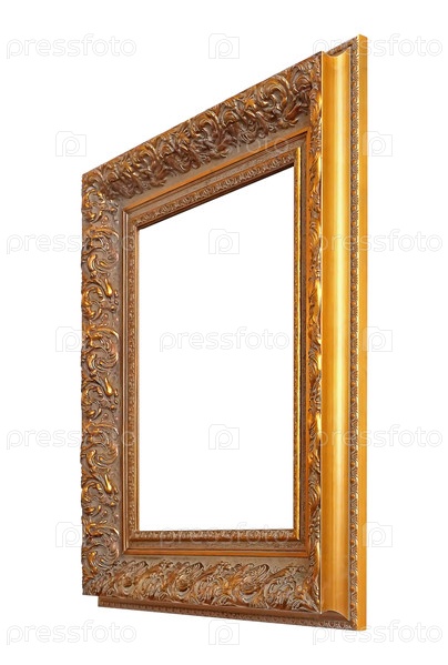 Золотая рама для картин, зеркал или фотографий в перспективе изолирована на белом фоне