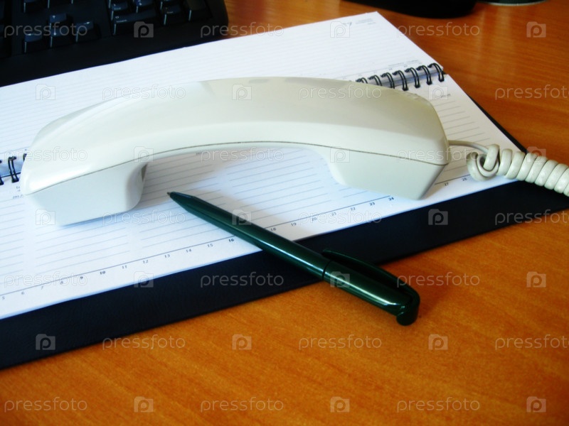 Телефонная трубка и ручка лежат на блокноте на рабочем столе