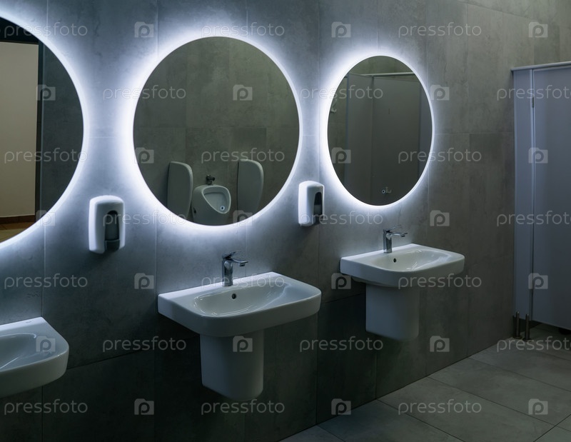 Интерьер современного общественного туалета с белыми раковинами и светодиодными фонарями