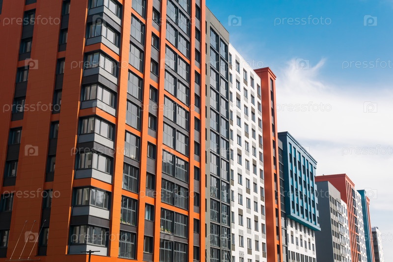 Современные многоквартирные дома с оранжево-белыми фасадами