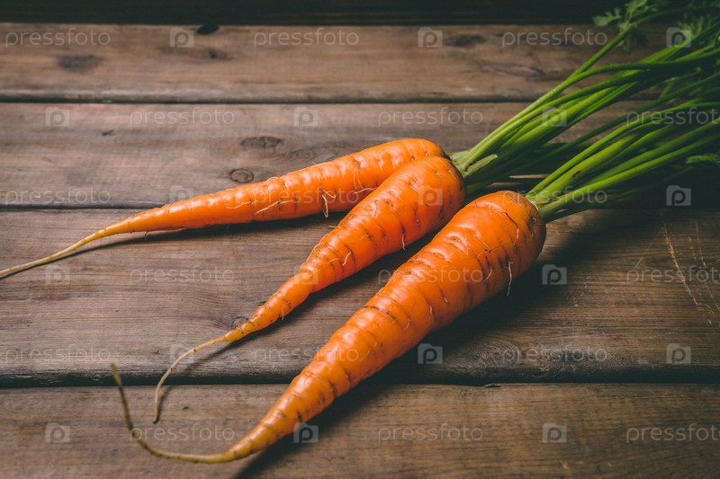 Свежая вкусная морковь на деревянном деревенском столе. Здоровая еда. Овощи