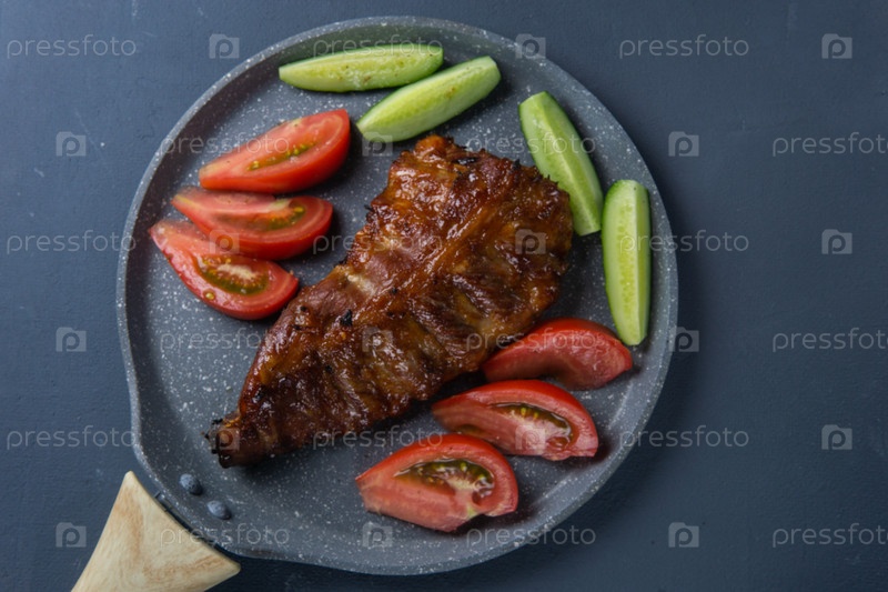 Запеченные свиные ребра с медом лежат со свежими нарезанными помидорами и огурцами на темно-серой бетонной столешнице