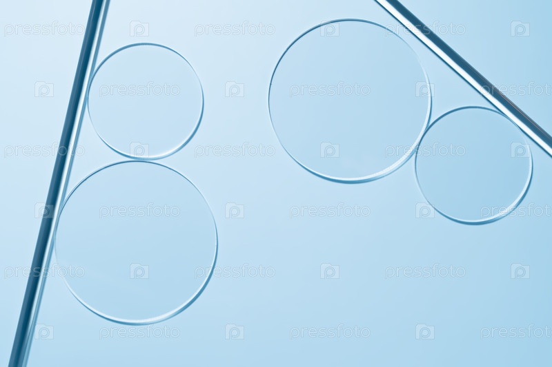 Пустые блюда Петри на синем фоне. Яркий солнечный свет. Глубокие тени. Контраст. Лаборатория. косметический лабораторный предмет, круглое прозрачное стеклянное блюдо