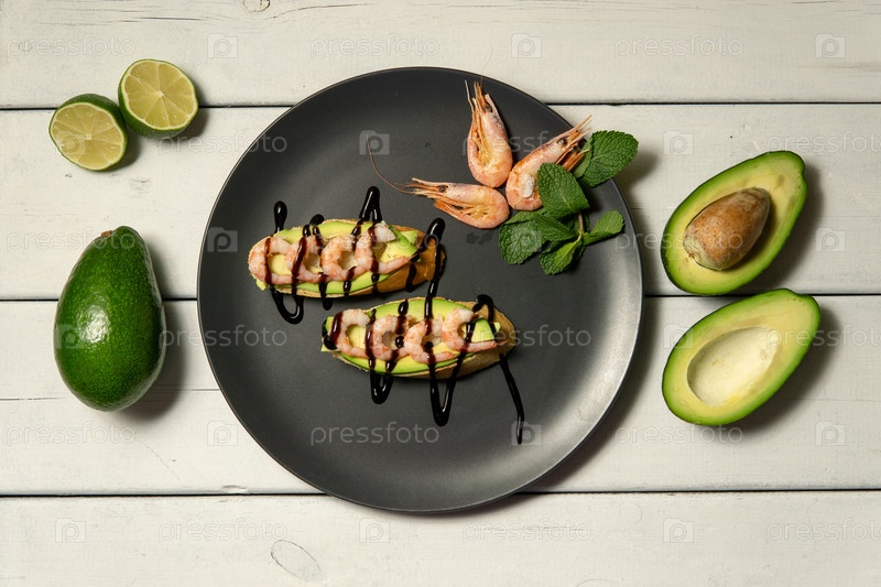 Брусчетта с креветками, авокадо и лаймом на белом деревянном фоне