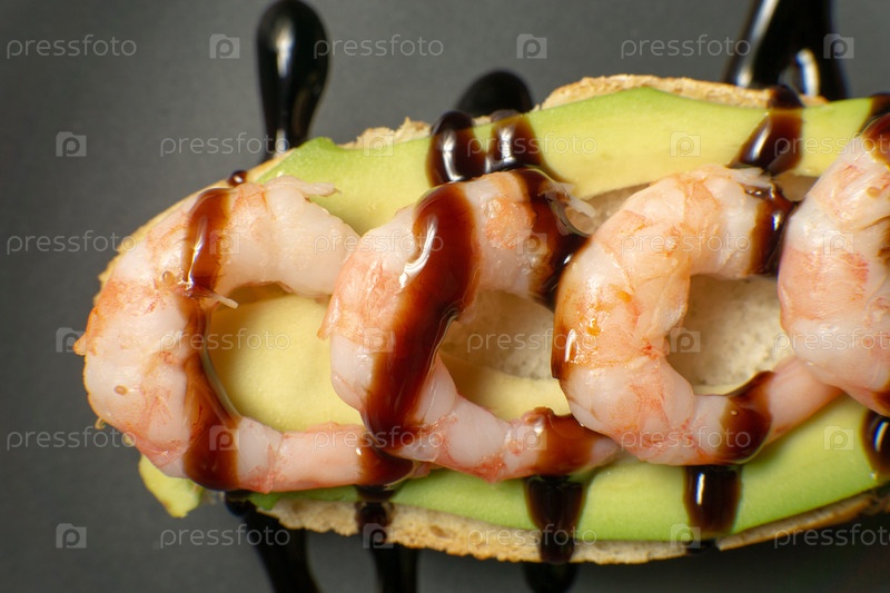 Брусчетта с креветками, авокадо и лаймом на тарелке