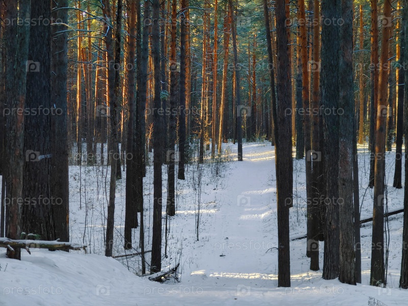 Тропа в зимнем лесу вечером