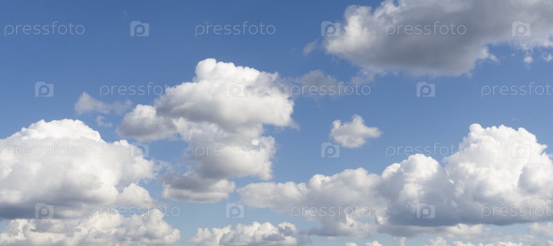 Чистое голубое небо с бело-серыми облаками. Облака кумулусов на голубом небе