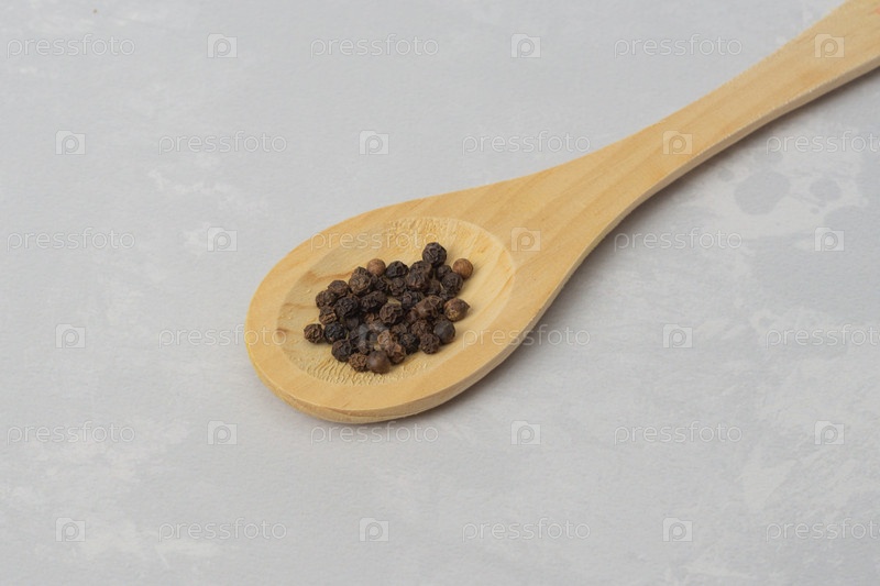 Черные перцы на деревянной ложке на сером фоне. Сухая пряная приправа для готовых блюд