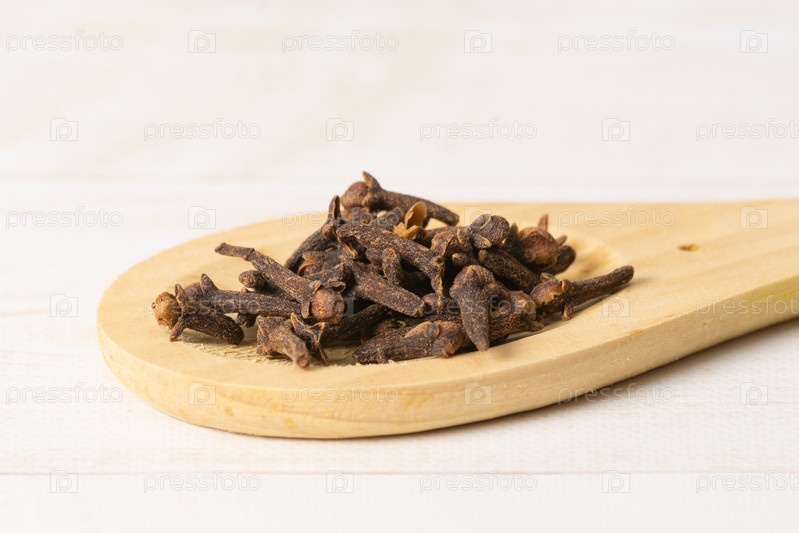 Сушеные гвоздики в деревянной ложке на деревянном светло-коричневом фоне