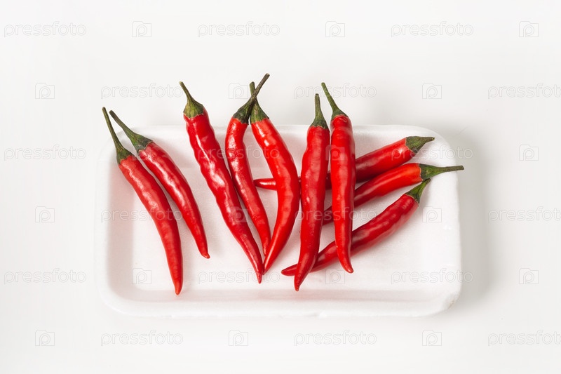 Группа красного перца чили в упаковке на белом фоне. Красный перец чили упакован для продажи