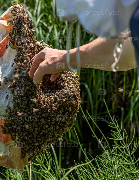 Пчеловод собирает пчелиную семью с помощью корзины. Роение пчел