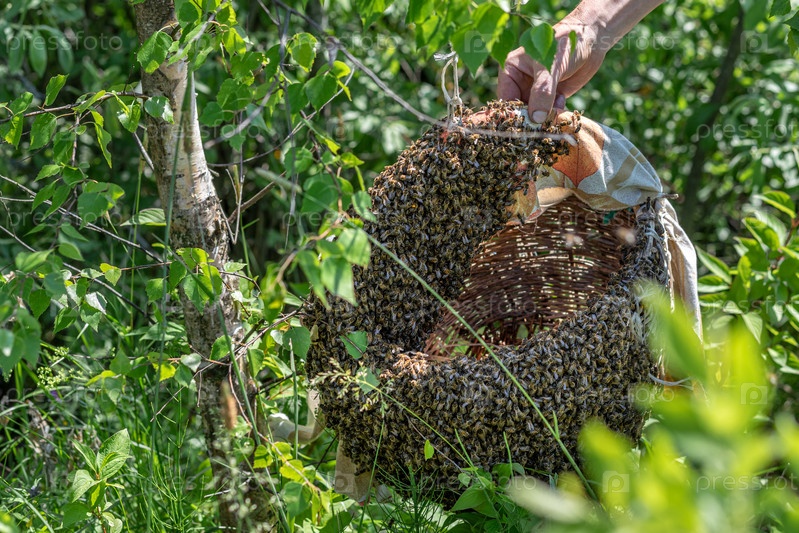 Пчеловод собирает пчелиную семью с помощью корзины. Роение пчел