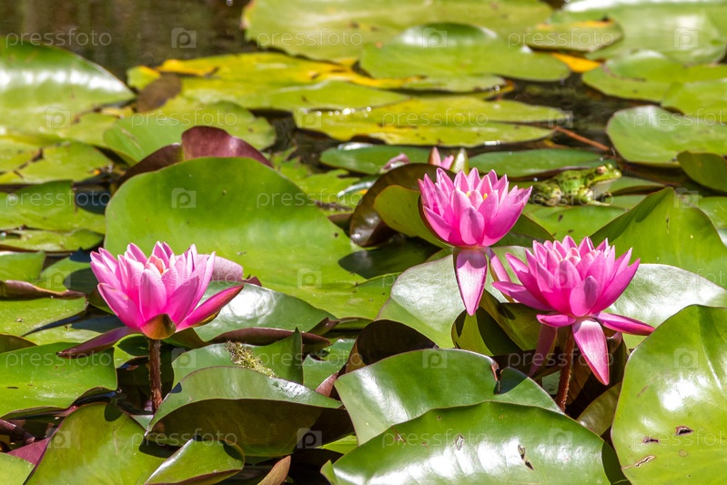 Розовые водяные лилии кувшинки и лягушка на заднем плане в пруду