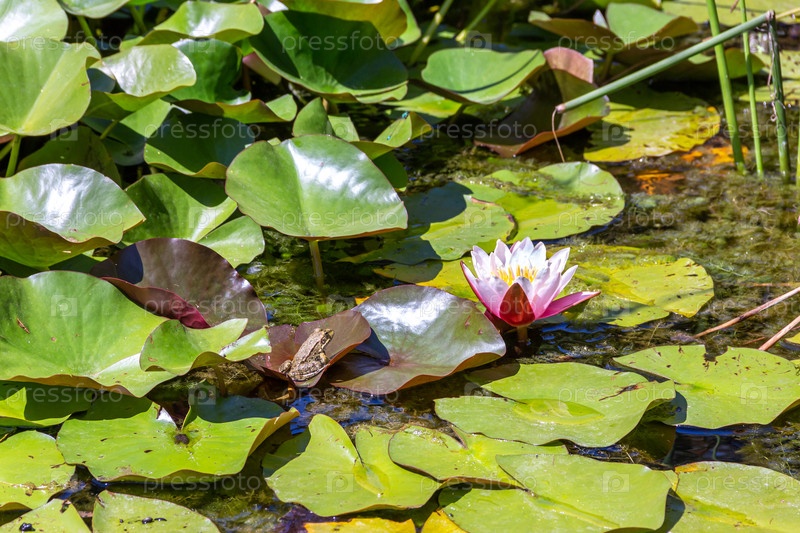Лягушка в пруду смотрит на водяную лилию