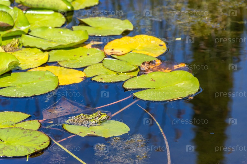 Речной лягушка (лат. Pelophylax lessonae) на листе водного лилия в пруду