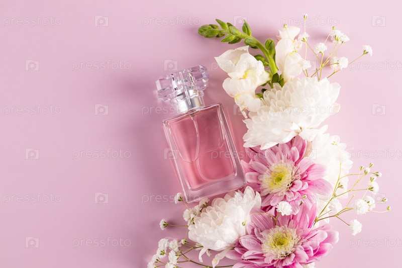 Элегантная бутылка духов с изысканным цветочным ароматом на розовом фоне среди белых и розовых цветов. Пустой макет бутылки. вид сверху