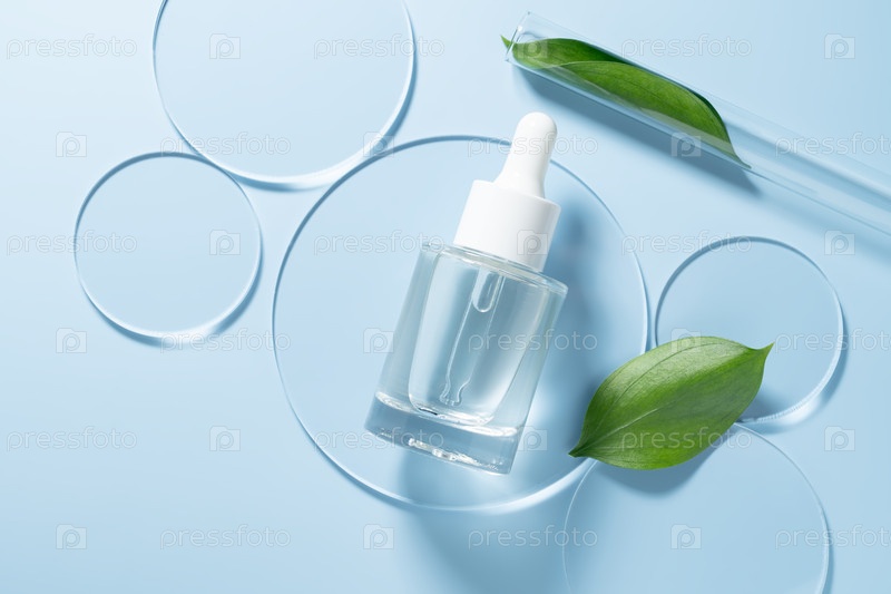 Органический косметический продукт, натуральный ингредиент и лабораторная стеклянная посуда на синем фоне