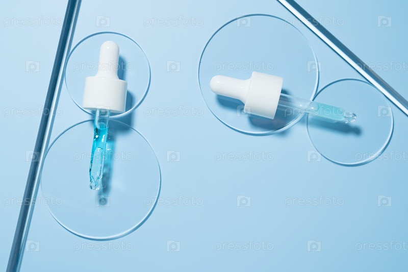 Стеклянная капельница с наливкой жидкой синей сыворотки в чашку Петри. на синем фоне. Современный косметический образец сыворотки, концепция ухода за кожей