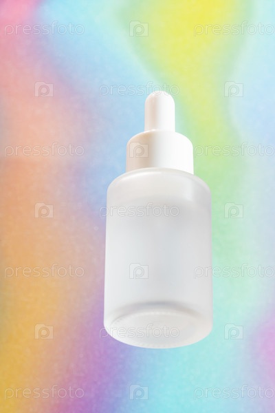 Нижний вид матовой стеклянной бутылки с пипеткой на радужном фоне. Презентация косметической упаковки продукта. Немаркированная бутылка капельницы