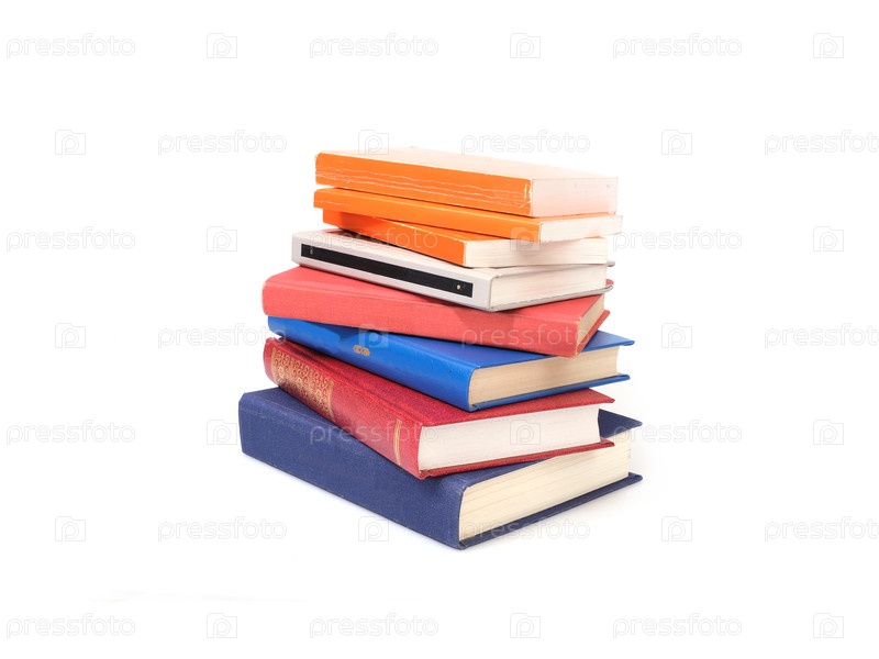 Стек книг в цветных обложках с белыми листами, изолированными на белом фоне
