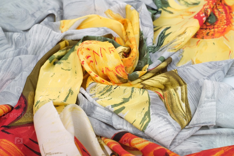 Яркий шелковый шарф с цветочными узорами. Текстильный изолированный фон