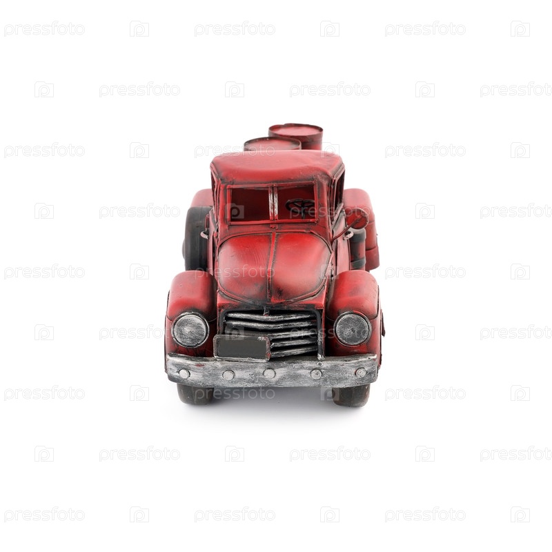 Металлическая модель старого грузовика с бочками для топлива (изготовлена в 1934 году) изолирована на белом фоне