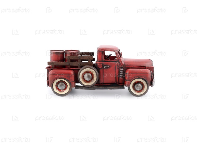 Металлическая модель старого грузовика с бочками для топлива (изготовлена в 1934 году) изолирована на белом фоне