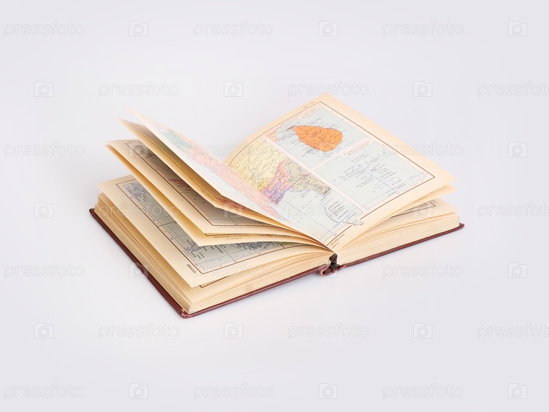 Открытый географический атлас с картами мира. Изолированная книга, изолированная на белом фоне