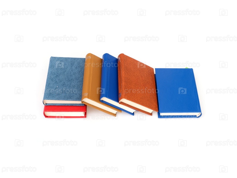 Стек красных, синих, желтых и коричневых книг, изолированных на белом фоне