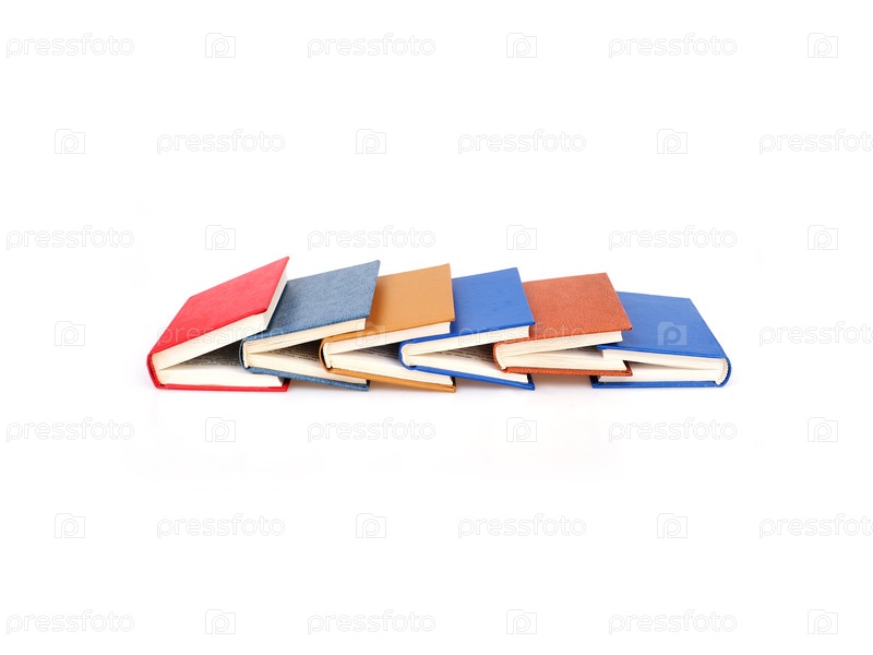 Стек красных, синих, желтых и коричневых книг, изолированных на белом фоне