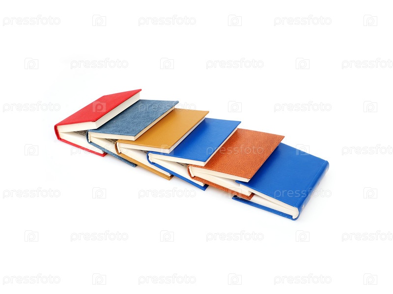 Стек красных, синих, желтых и коричневых книг, изолированных на белом фоне