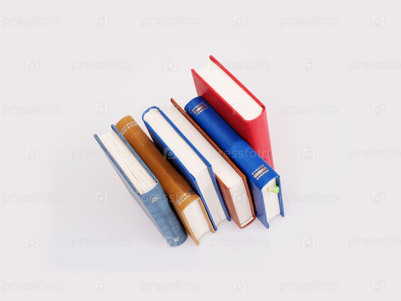 Стек красных, синих, желтых и коричневых книг, изолированных на белом фоне