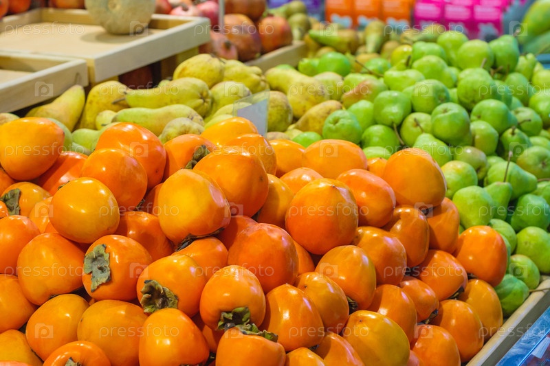 Вид на кучу хурмы и груш в супермаркете