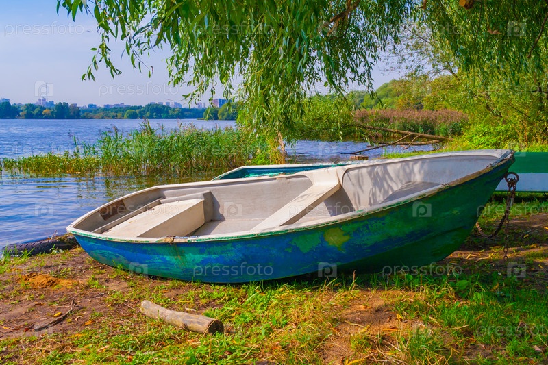 Старая деревянная лодка на берегу на фоне зеленых деревьев