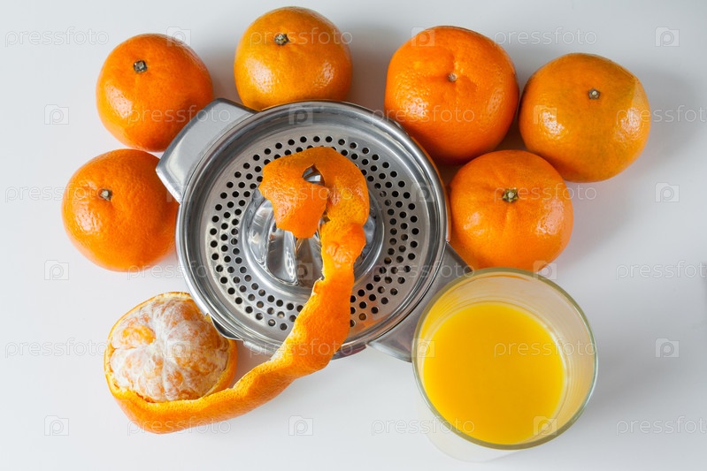 Ручная металлическая соковыжималка в окружении мандаринов и стакан сока на белом фоне