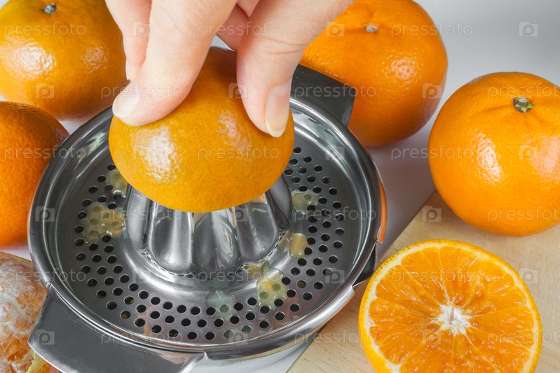 Приготовление мандаринового сока, руки выжимают сок на ручной соковыжималке