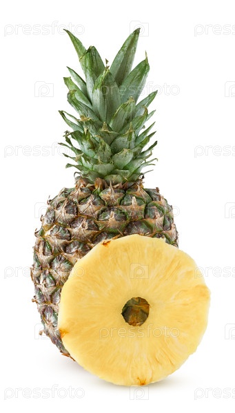 Ананас, цельный и круглый очищенный срез, изолированный на белом фоне