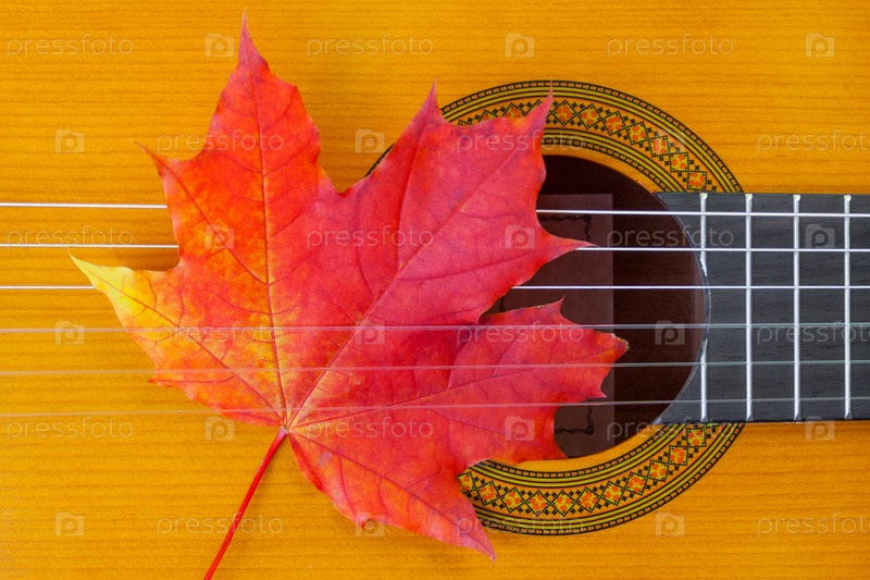 Вид на фрагмент акустической классической гитары с осенним красным кленовым листом