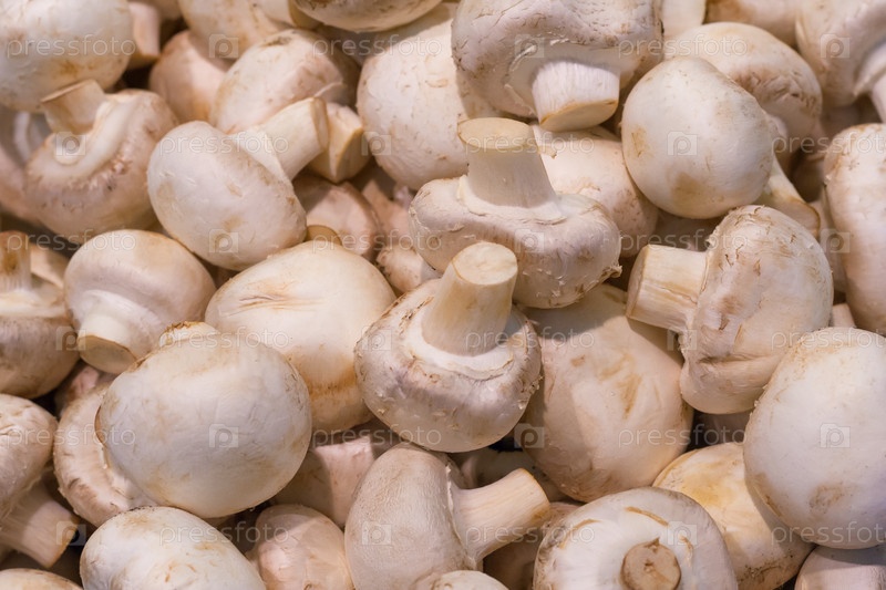 Груда грибов шампиньона в магазине как фон, текстура