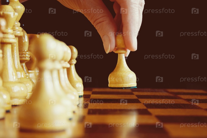 Рука шахматиста делает ход белой пешкой вперед (тонированный)