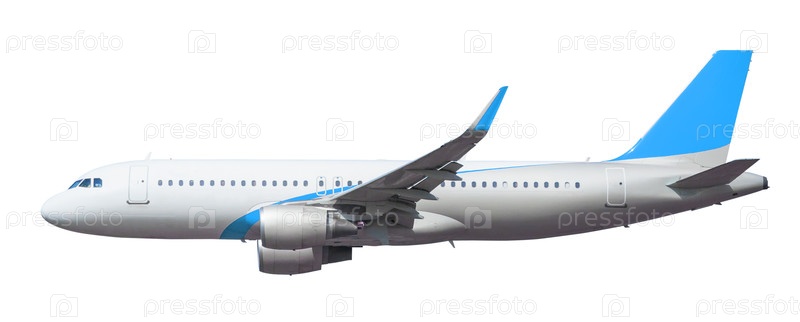 Вид сбоку летающего самолета, изолированного на белом фоне с обрезкой пути