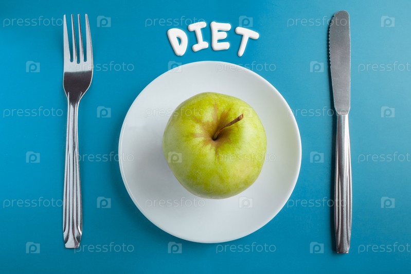 Вид сверху на зеленое яблоко на тарелке, с вилкой и ножом на синем фоне с надписью 'диета'