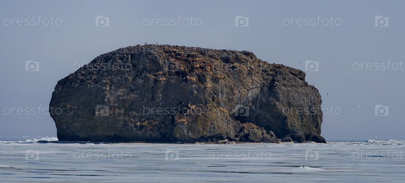 Россия. Дальний Восток. Курильские острова. Многочисленные морские чайки на скалистом острове Охотского моря - идеальное место для защиты гнезд