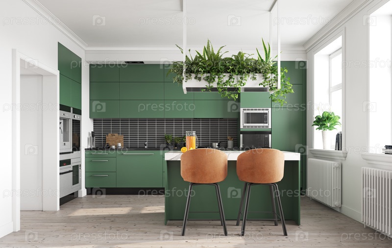 Стильный зеленый кухонный интерьер с деревянными стульями и потолочными растениями. 3d рендеринг