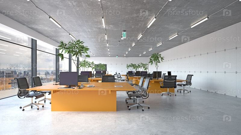 Просторный открытый офис с оранжевыми столами и комнатными растениями. 3d рендеринг