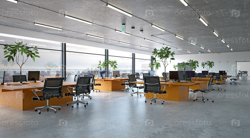 Современный офисный интерьер в промышленном стиле с общими столами и зеленой. 3d рендеринг